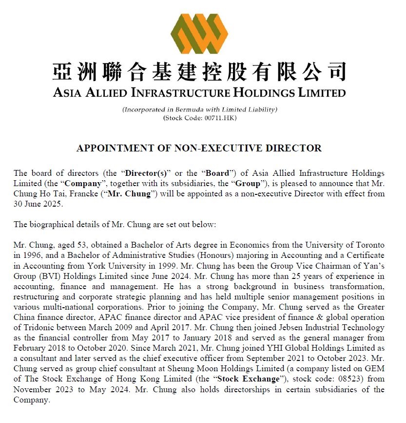 We are thrilled to announce that Mr. Chung Ho Tai, Francke will be joining the Board of Directors at Asia Allied Infrastructure Holdings Limited as a non-executive Director, effective June 30, 2025.